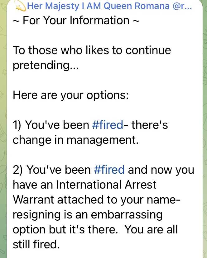 2)あなた方はお役御免です、現在あなたの名前は国際逮捕状に載っています - 辞任は恥ずかしいオプションですがそうしてください。あなた方全員は既に首になっているのですから。