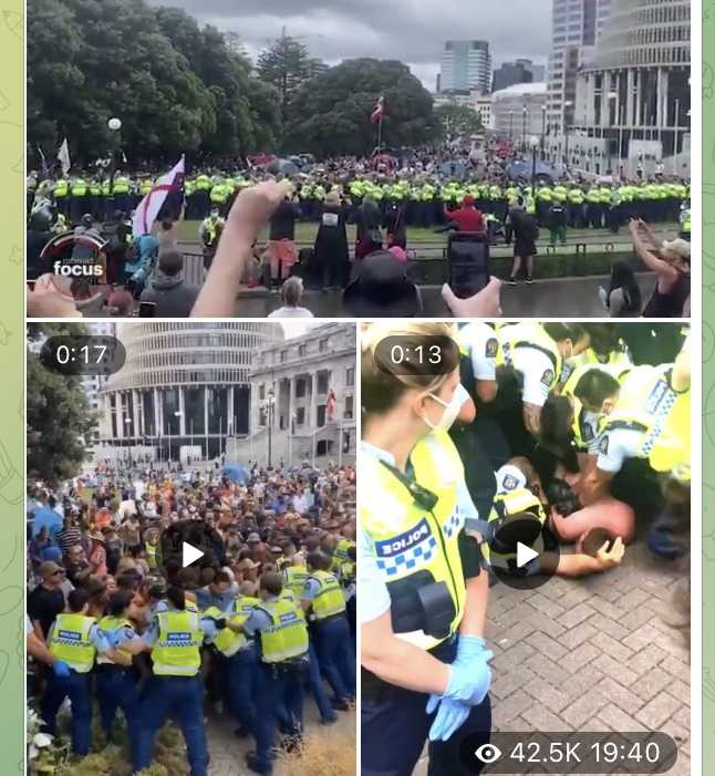 *ニュージーランド、ウェリントンで警察官とCovid義務化に反対するデモ隊がぶつかり?、120人が拘束された。容疑は不法侵入と妨害。👇