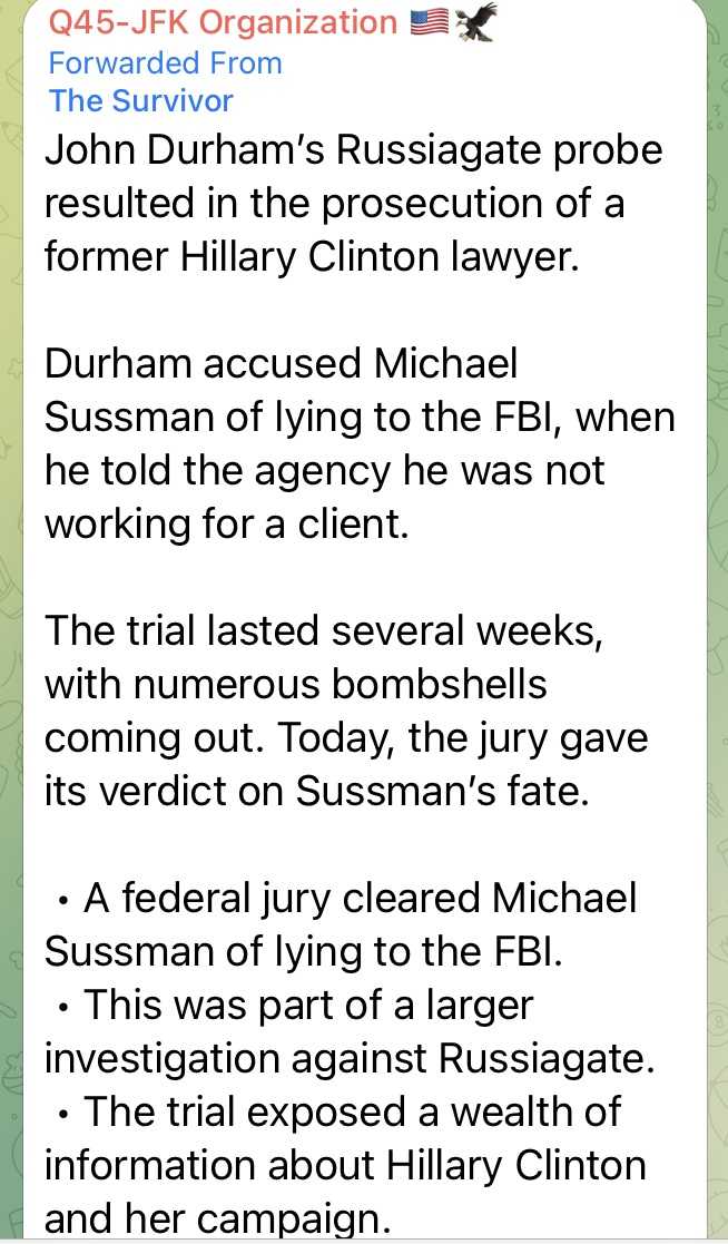 ダーラムはマイケル サスマンが、ヒラリーの弁護士ではなかったとFBIに嘘をついた容疑を追求していた。