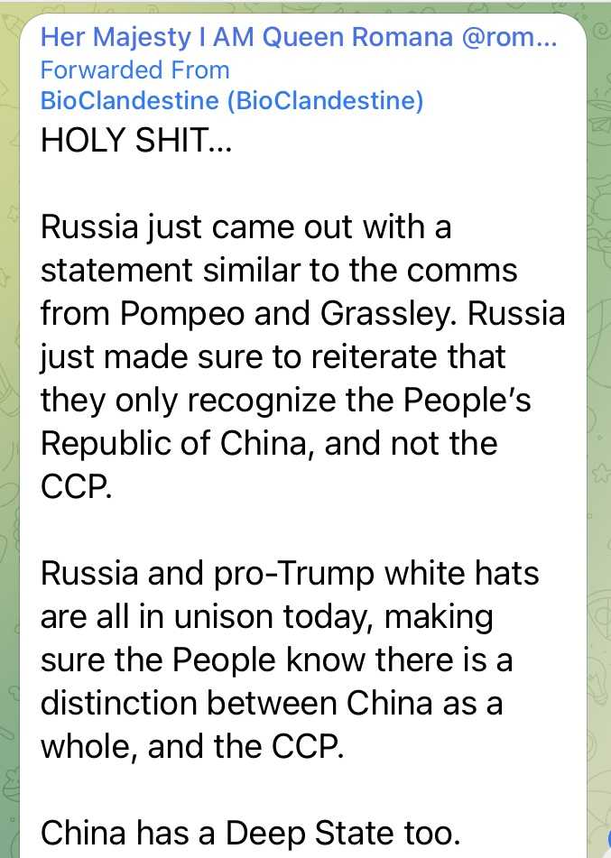 ロシアとトランプ側のホワイトハットが今日意見が一致した。人々が一国としての中国と、CCPとを区別しているのは確かだとしている。