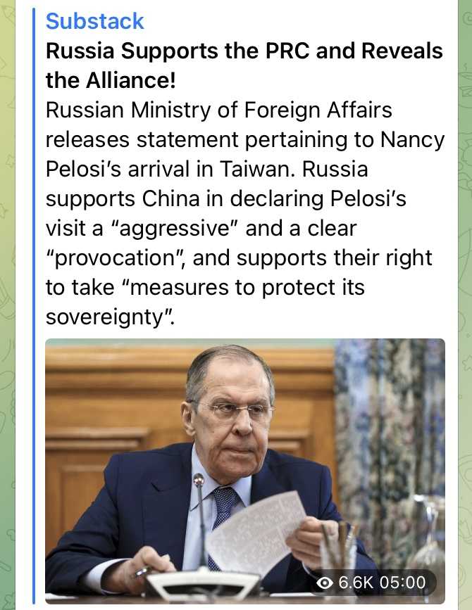 ロシアの外務大臣はペロシ台湾訪問に関して声明を発表した。ロシアは中国を支持するもので、ペロシの台湾訪問を "侵略” だとし、明らかに "挑発行為” であると非難した。そして中国による台湾統治権を支持すると表明した。