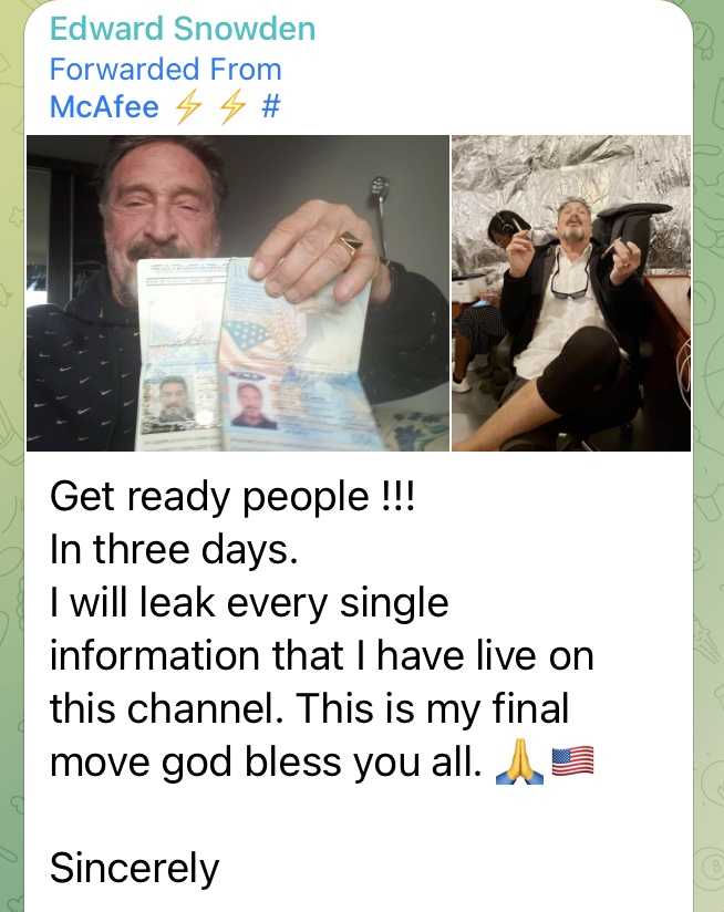 こちらはマカフィーさんからの転送メッセージをスノーデンさんが今朝投稿されたもの