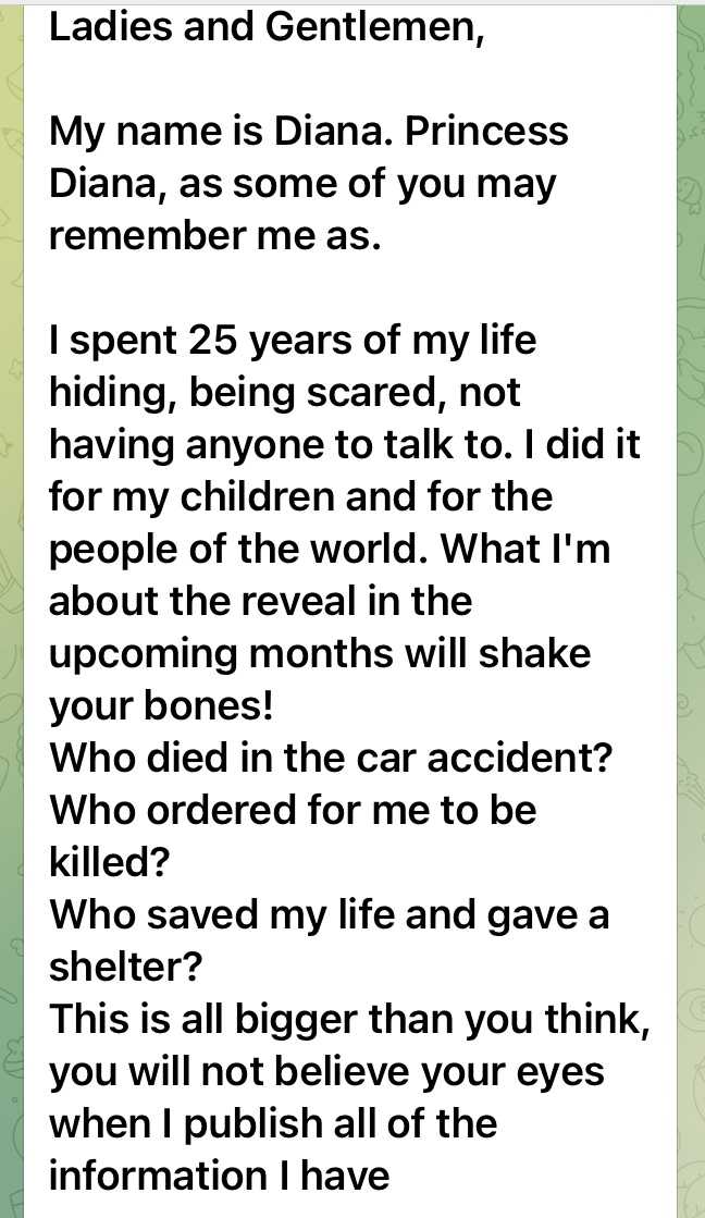 今朝一番でダイアナさんがテレグラムに現在のお姿をお見せになりました。エリザベス女王が公に亡くなり、葬儀も行われたことで、オペレーション ロンドンブリッジは次の段階に入りました。