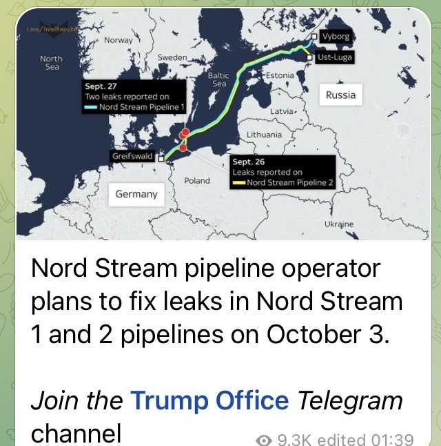 ノルド ストリーム パイプラインのオペレーターがノルド ストリーム パイプライン1と2の漏れ口の修理を10月3日に行う予定だ。
