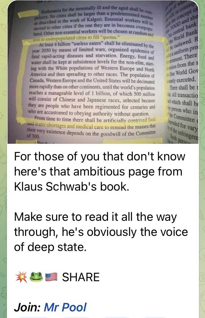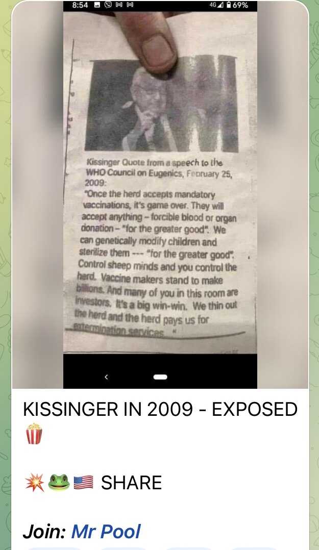 画像中:キッシンジャーが2009年にWHOの優生学会議で言った。”集団が一旦ワクチン接種義務化を受け入れたら、ゲームは終わる。彼らはなんでも受け入れるようになる - 強制的な血液や臓器提供 - ”より大きな利益のため” 我々は子供の遺伝子操作を行い、彼らを不妊にできる - ”より大きな利益のため”。