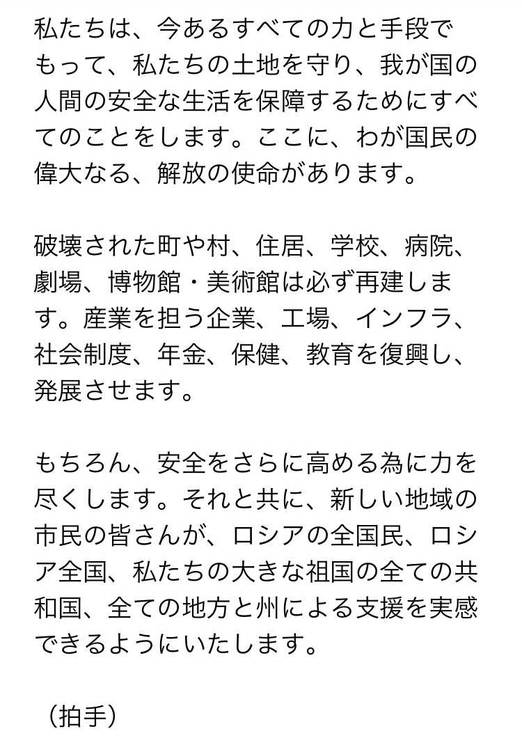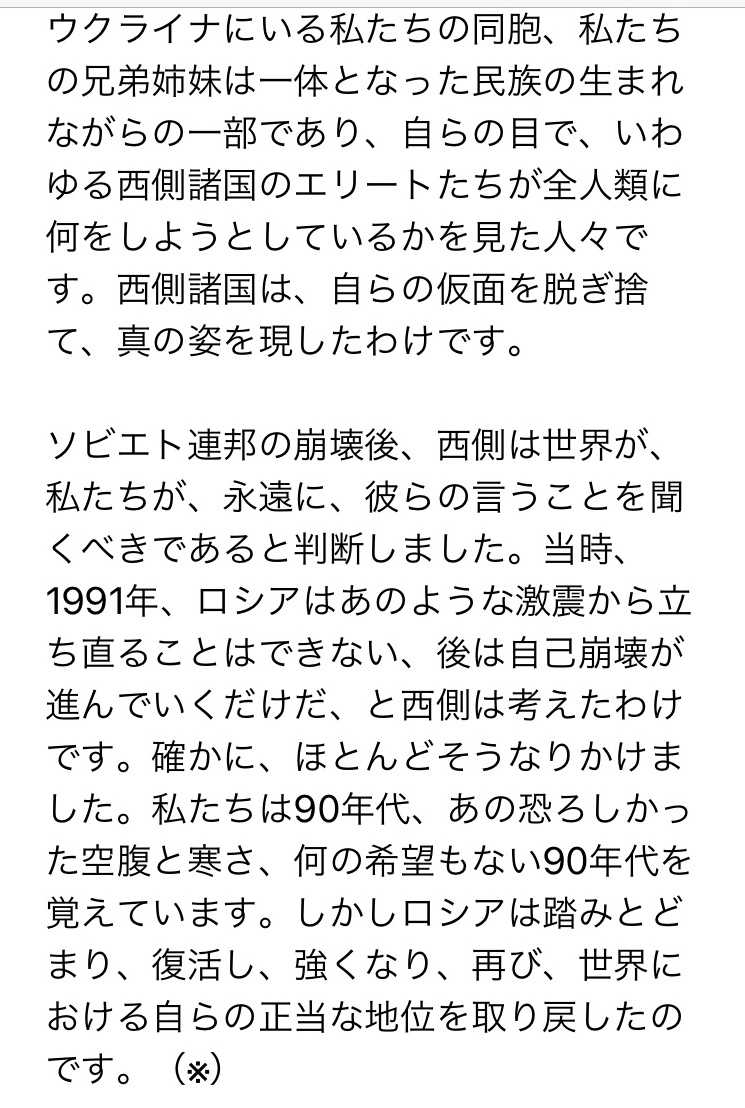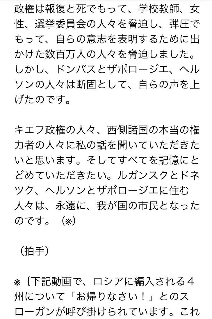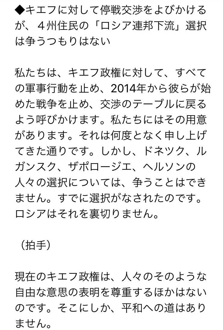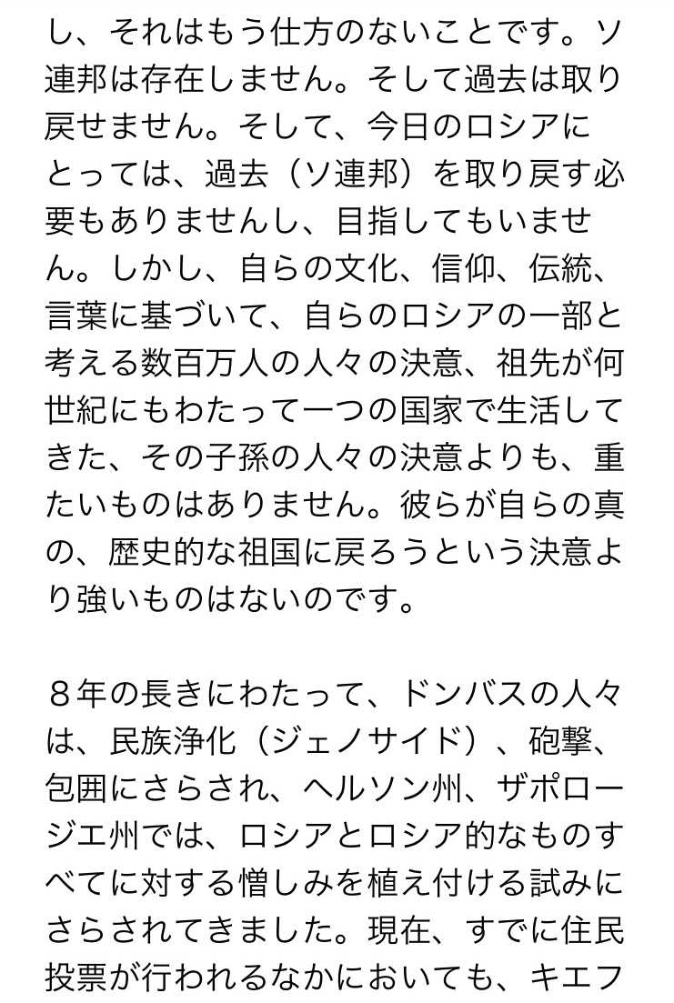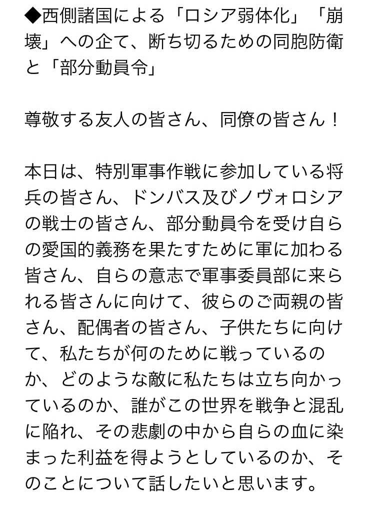 こちらが昨日参政党のメルマガにあった9月30日のプーチンさんの演説の全文日本語訳です。