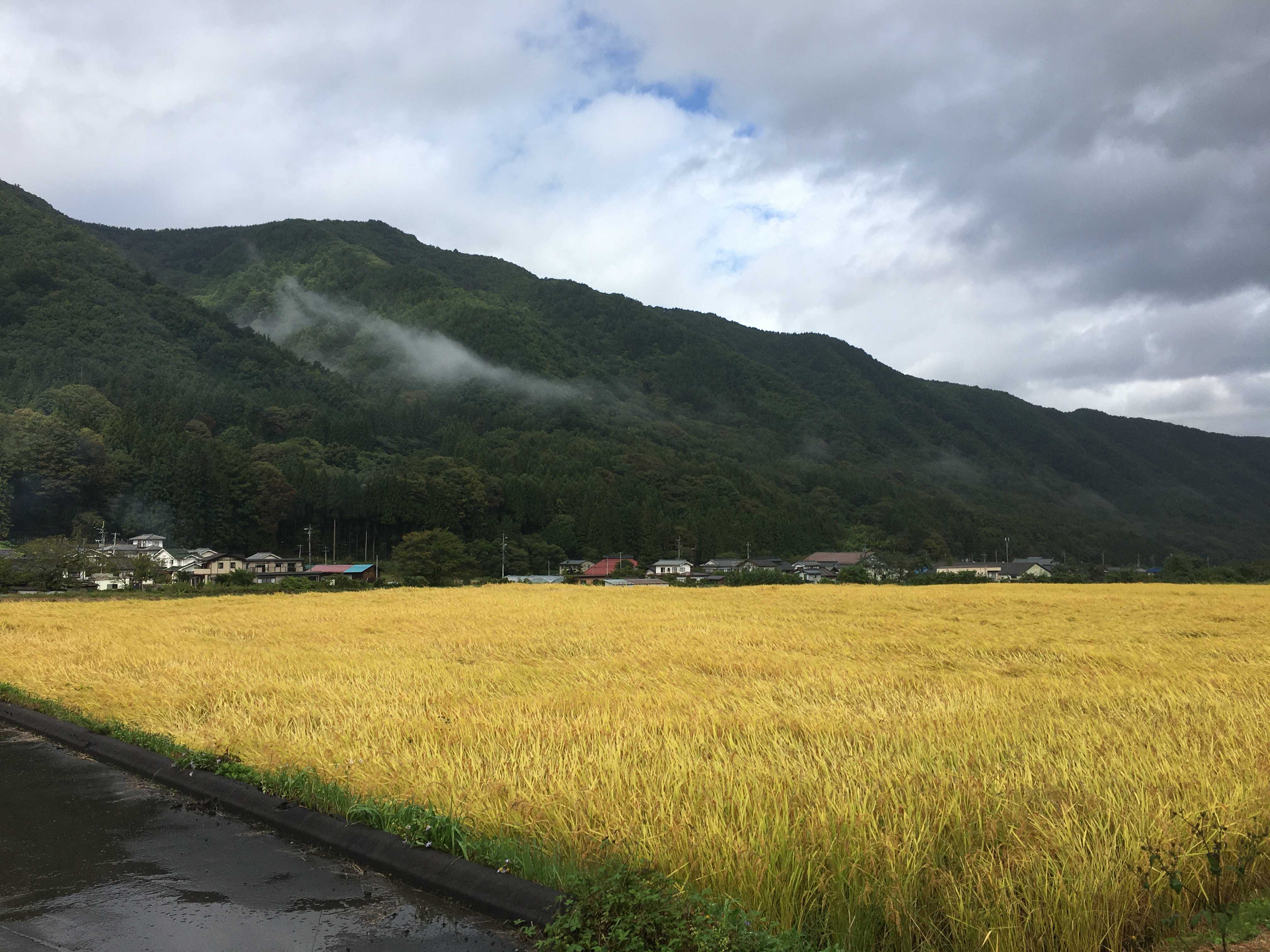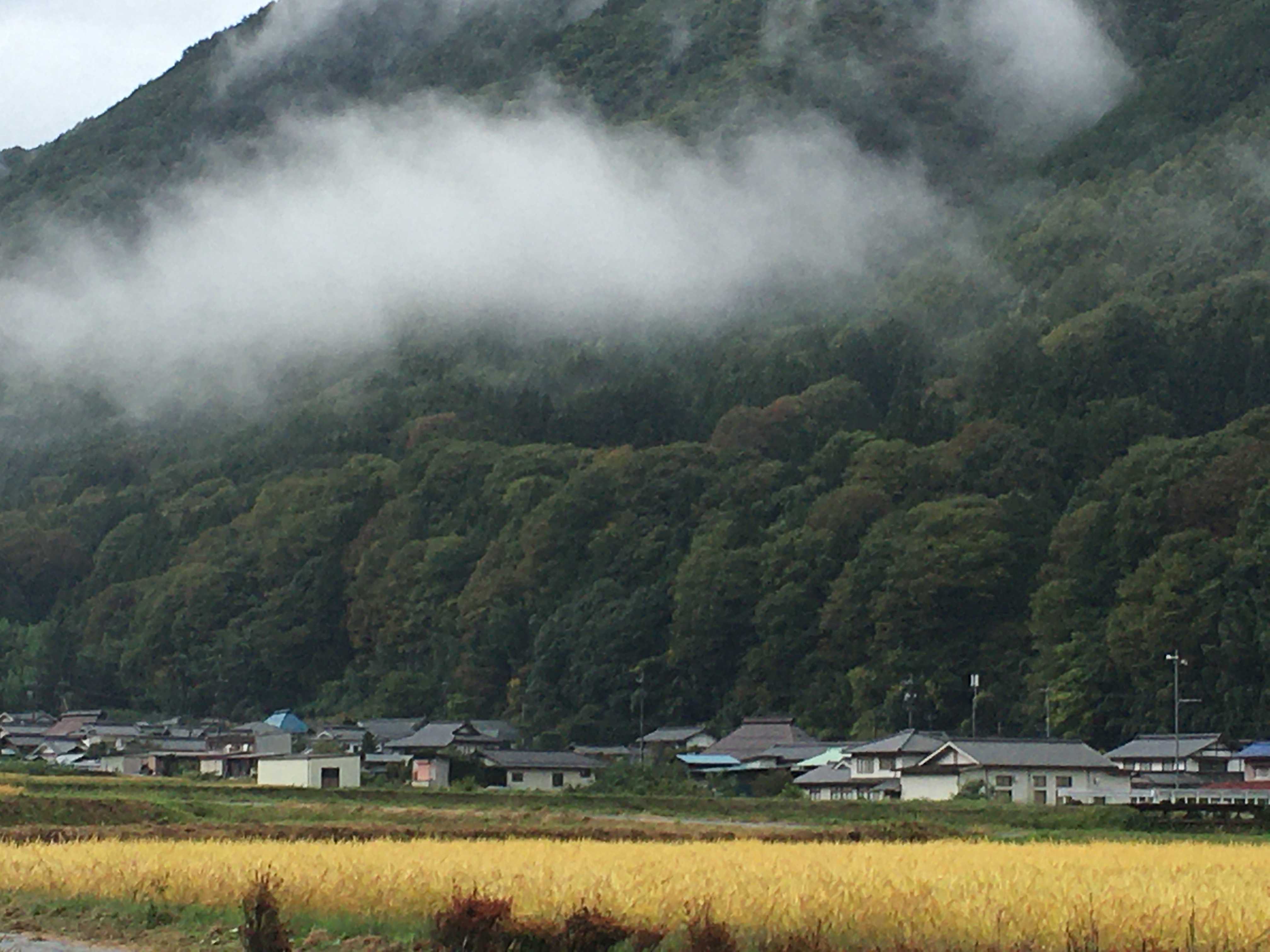連日の雨と寒さのあと、昨日は午後から青空ものぞきました。山の上の方では雲が覆い被さっていたのですが、集落の近くを車で通ると一瞬ですが、光が山の木々を照らし、雨に打たれた稲穂に元気が戻ったように見えました。