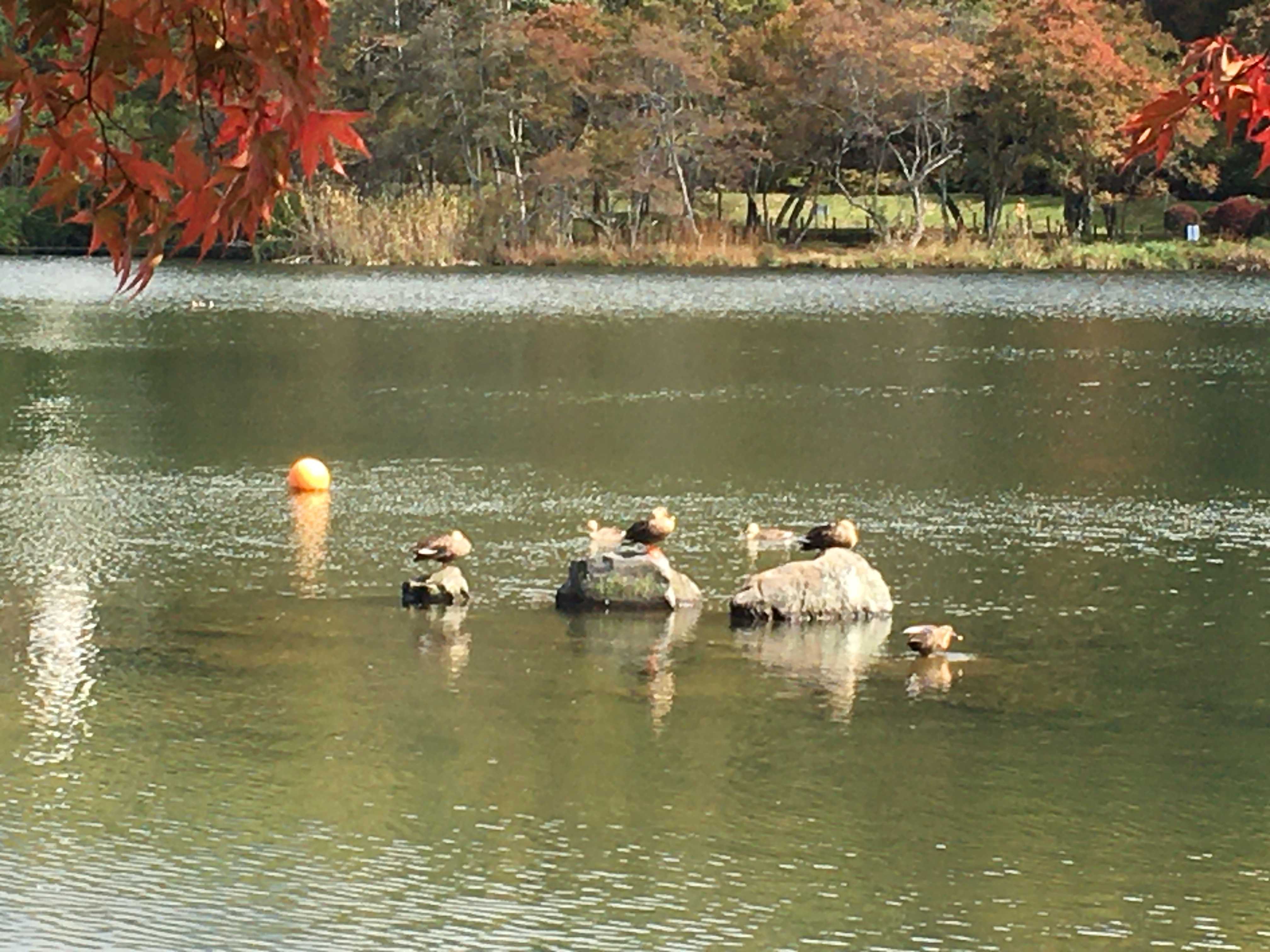 湖面の岩で日向ぼっこをするカルガモたち