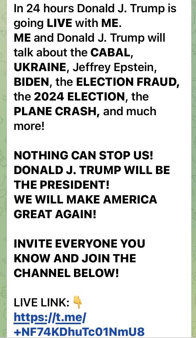 24時間後に、ドナルド J. トランプが私と一緒にライブをします。私とトランプはカバル、ウクライナ、ジェフリー エプスタイン、バイデン、不正選挙、2024年の選挙、飛行機事故などについて話すつもりです。
