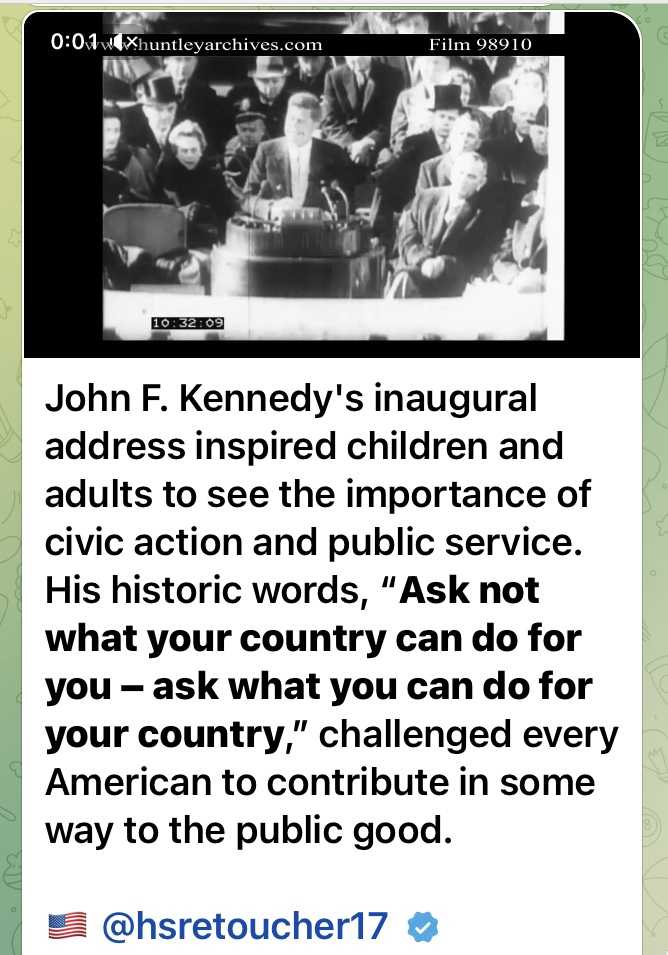 彼の歴史に残る言葉、”あなたの国があなたに何ができるかではなく、あなたがあなたの国に何ができるかだ。” この言葉はアメリカ人がパブリックのために奉仕する考えの元になった。