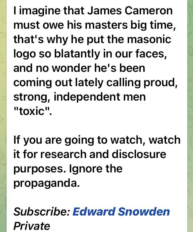 ジェイムス キャメロンは彼の達人として負うところが大きいと思う、何故なら彼はメーソンのロゴを大胆にも我々にはっきりと見せているからだ。そして最近になって、自信と独立心がある強い人々のことを”毒"呼ばわりしているのも頷ける。
