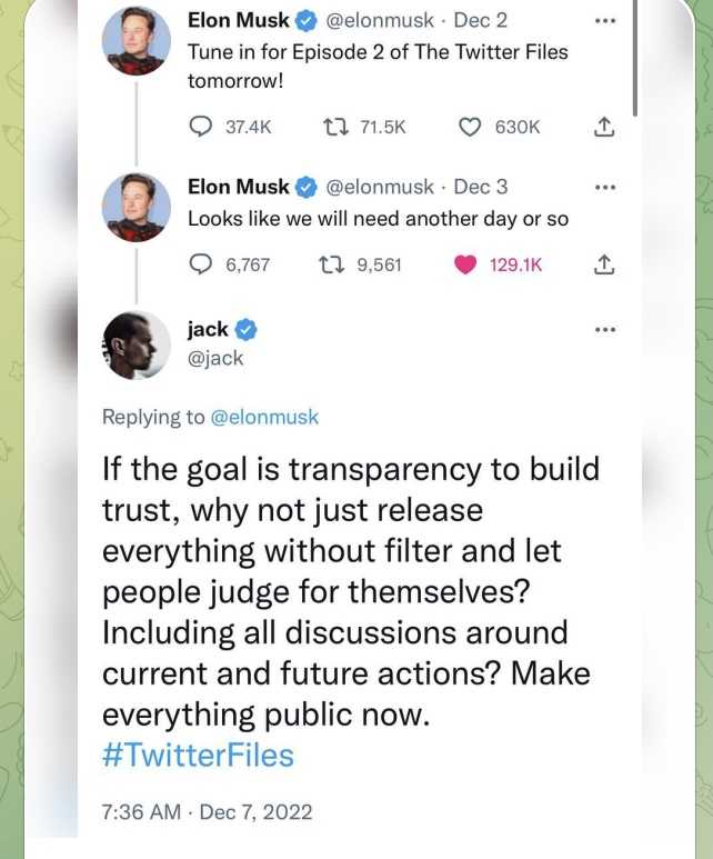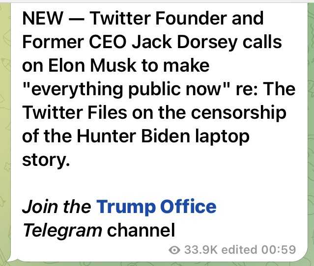 NEW ー ツイッターの創立者で元CEOのジャック ドーシーが、イーロン マスクに、ハンターバイデンラップトップについての検閲ファイルについて、”全てを公表しろ”と言った。