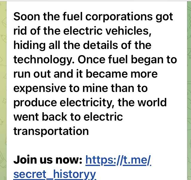 すぐに、石油会社が電気自動車を排除し、技術の詳細については隠された。石油が足りなくなると、石油を発掘する方が発電するよりも費用がかかるため、世界は電気の交通手段に戻った。