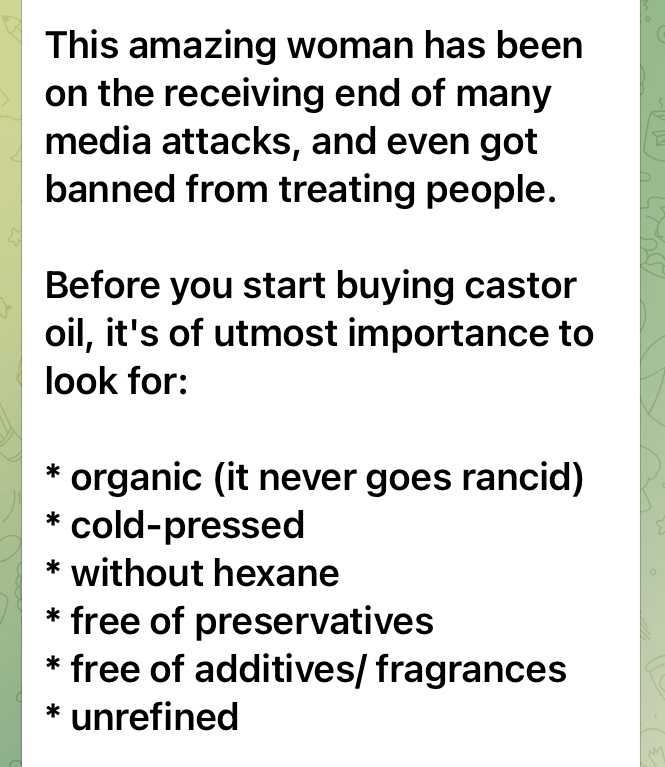 キャスターオイルは日本語でひまし油です。昔のアメリカ映画によく出て来たのを覚えています。子供が具合悪くなった時などにひまし油を飲ませていました。ロックフェラーの偽医療が出て来る以前に使われていた薬草やひまし油など、昔の人々の知恵だったのではないでしょうか?