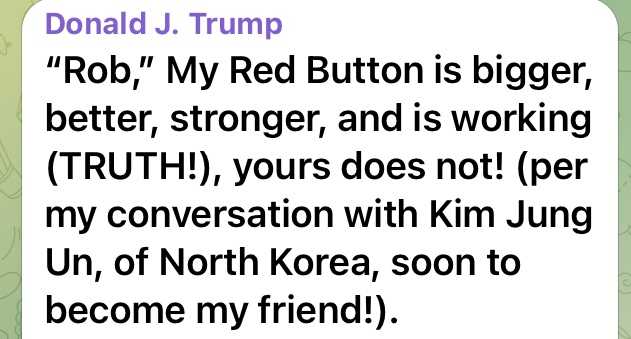 ”ロブよ” 私の赤いボタンの方がずっと大きく強く良いものだ、そして機能している(真実!)おまえのはそうじゃないだろ!(私が北朝鮮の金正恩と交わした会話について言うと、彼はもうすぐ私の友人になるんだ!)