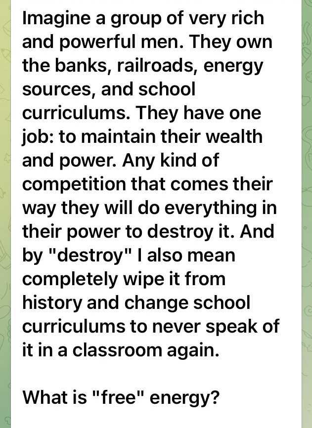 フリーエネルギーの抑圧は、彼らがグローバルな貿易や、石油、他の資源から利益を得るためです。そして一方で彼らのやりたいように人口をコントロールしているのです。