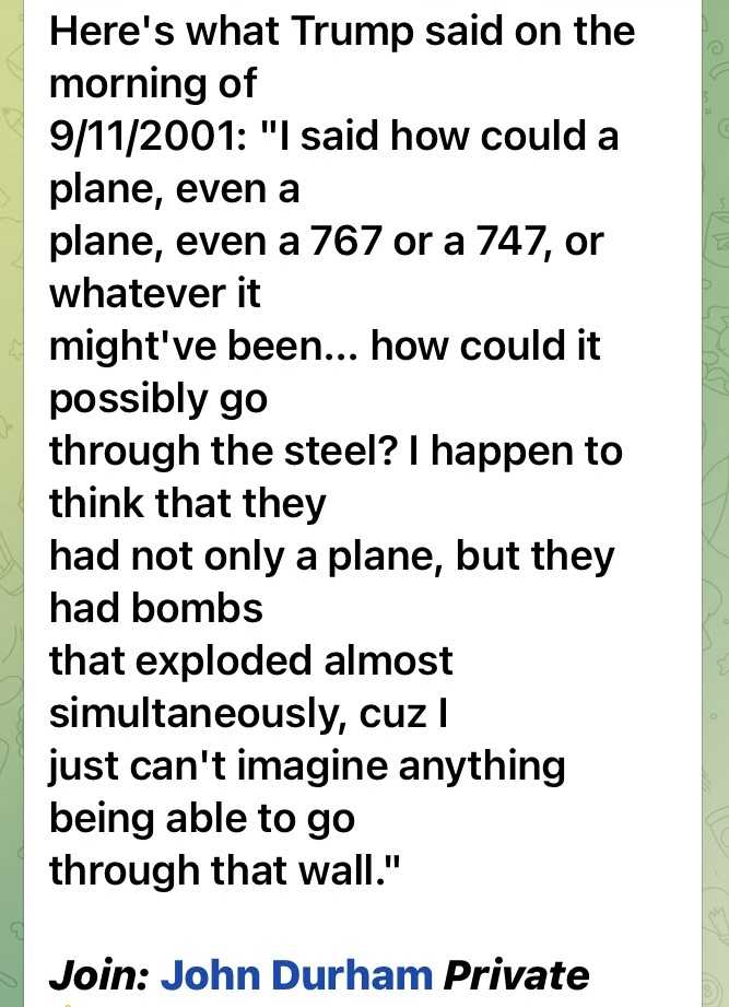 ここに、2001年9月11日の朝起きたことについてトランプが言ったことがある:”どうやったら、飛行機が、767であろうと、747であろうと、他であったとしても、どのようにしたら鉄を通り抜けることが可能なんだ? 飛行機だけじゃなく、飛行機に爆弾が積んであって同時に爆発したのか、私にはどうしても何かがその鉄の壁を突き抜けるなんて想像ができないんだ。”