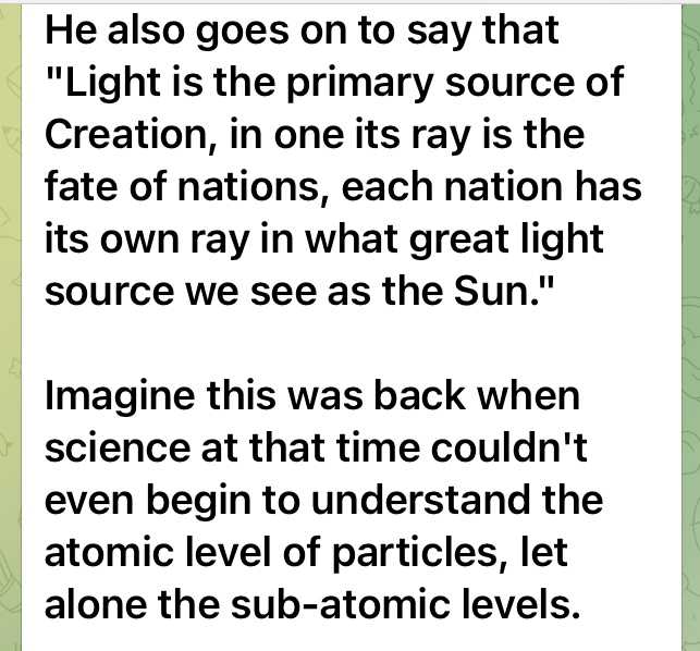 彼はまた、「光は創造の主な源であり、ある国ではその光線が国家の運命であり、どの国も私たちが太陽と見なす偉大な光源の中に独自の光線を持っている。」とも述べています。