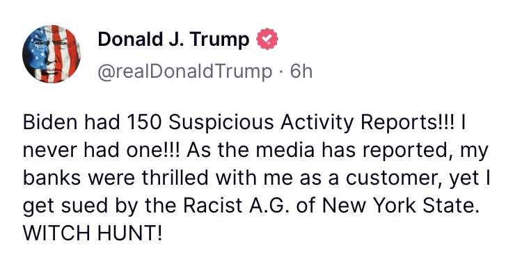 バイデンには150もの犯罪疑惑のレポートがある!私には一つもない!!! メディアが報道したように、私の銀行は私のような顧客に喜んでいるだろう、しかし私はニューヨーク州の人種差別主義者の検事総長に訴えられる。これは魔女狩りだ!