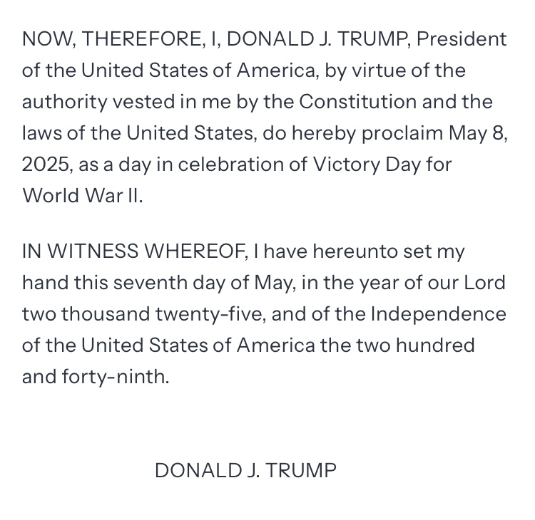 👇ホワイトハウスから、 "第二次世界大戦勝利の日宣言、2025年、5月8日” (英語は最後の部分のみ載せてます)