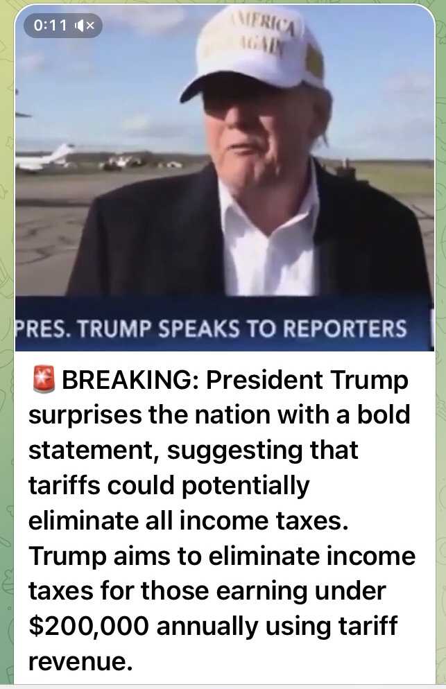 速報:トランプ大統領が大胆な言及でアメリカを驚かせた。関税が全ての所得税をなくす可能性が大きいと。トランプ大統領は、関税収入を使い、年$200,000以下の所得者から所得税を排除する計画だ。