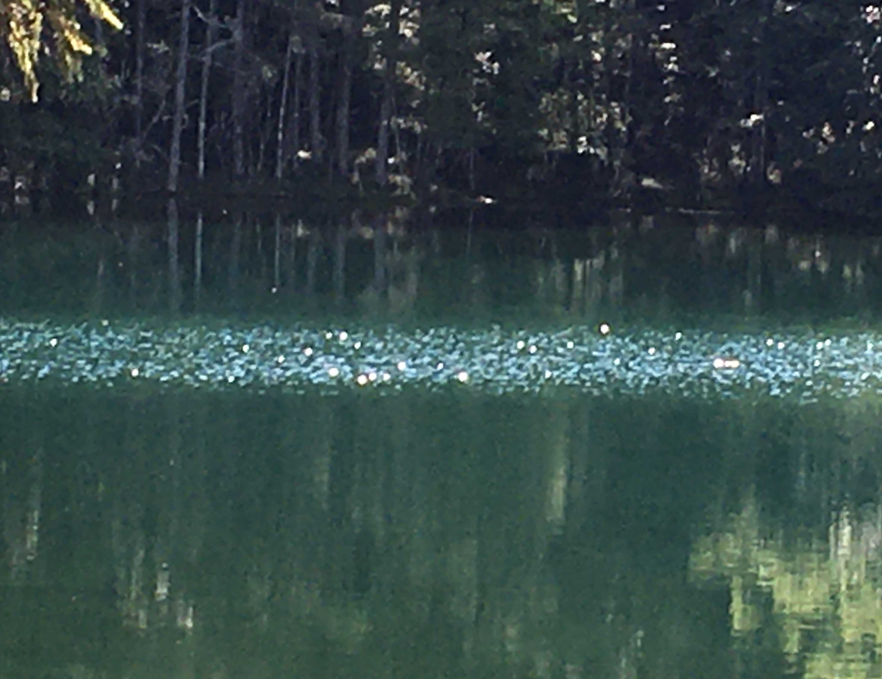 突然水面がキラキラと光りました。一直線になっていましたので、魚の群れ?が水面を飛び跳ねていたのかも知れませんが...肉眼ではダイヤモンドのように見え美しい光景でした。