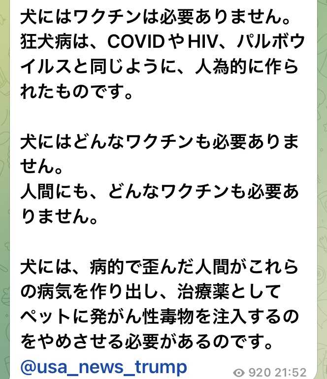 狂犬病自体も作られましたから、狂犬病のワクチンは毒以外の何ものでもありません。人を信頼し、人が大好きなワンコやニャンコたち、馬や豚や牛や羊たち、みんな自然の中でお日様の下で健康に生きているのです。彼らに対する裏切り行為を私は許すことができません.....