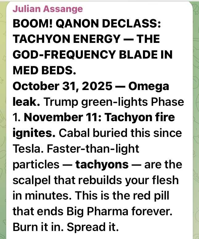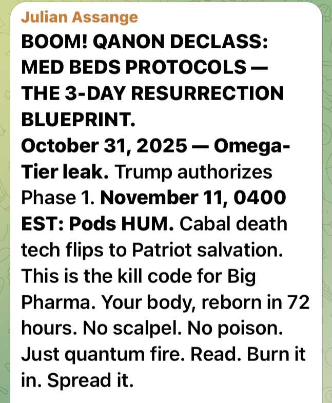 2025年10月31日 — オメガティアのリーク。トランプがフェーズ1を承認。11月11日、東部標準時0400:ポッドが稼働。カバールの死の技術が愛国者の救済に転換。これはビッグファーマへのキルコード。あなたの体は72時間で再生。メスも毒もなし。ただの量子の火。読んで、心に刻み、広めよ。