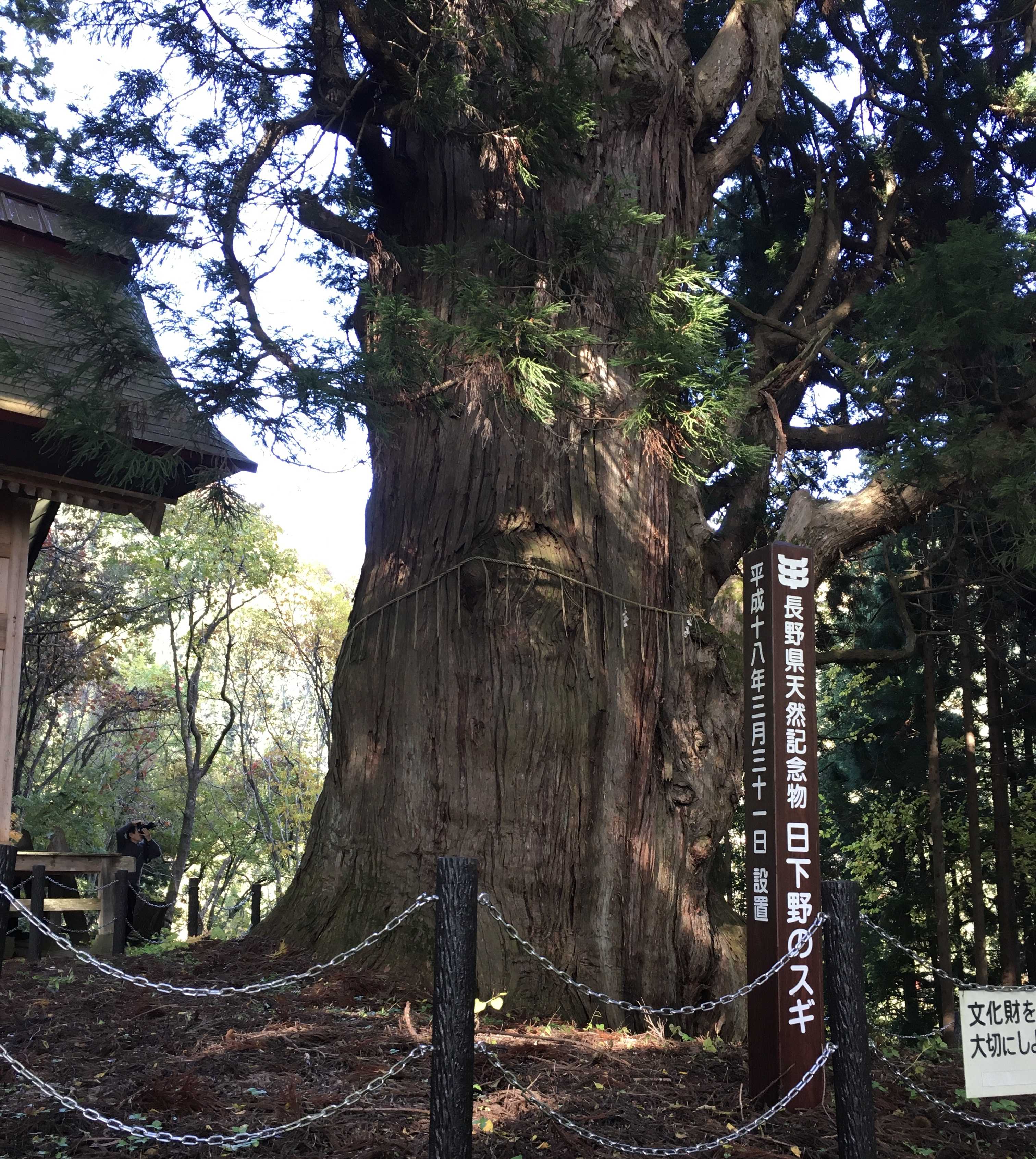 (左下で夫がカメラを構えています。目通り幹回りは11.4メートル、高さは40メートルに達しています。通称神代杉と呼ばれているこの大杉の樹齢は1300年とも2000年とも言われています。)