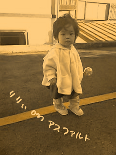 携帯バトルからの復活を果たした彼女から。りりぃの写真。たぶん彼女にとっては何気ない1枚。りりぃが!!!道路の上を!アスファルトの上を!歩いてますケド!!!スゲー。スゲー。スゲー。生まれて1年と1ヶ月。ココまで進化するんですねぇ・・・。この1年1ヶ月、全く成長していない私からしたら。酸素と水素から水!ぐらいの化学反応ぷりに見えます。いや。立ったのも。歩いたのも知ってたけど。なんかこう。なんでだろう。硬いアスファルトの上をって言うのに。転ばずに歩いてるんだなぁ・・と。当たり前のことに(*´ェ`)ボー...Σ(*゜ェ゜*)ハッ!とさせられちゃいました。12月にまた会えます。実際会ったら、感激しそうなんですけど。笑ディズニーでも、のしのし歩いて欲しいっす。りりぃへ。ちゃんとご飯食べるんだよ。楽しい夢見るんだよ。