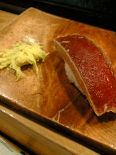 一人打ち上げ開催です。笑初めて一人で北浜行きました。私もすっかり大人になりました。笑にしても、やっぱうみゃーなー。マグロの漬け: 最初切り口がなくて、何かと思いました。チョコだって言われましたよ。笑厚切りで味も染みてて?うまーい!!刺身でわさび塗って食べるのもおいしそうでした。今日は、ガリと一緒に菊もいただきました。実家に住んでるときは結構良く食べたので、懐かしい味でした。おいしいなぁ。心に染みる食べ物ですねぇ。カジカの子:これ、最初に食べたときは感動したなぁ!いくらより小さくて皮?膜?が厚い感じ。弾ける感触がたまらんのです。”(*>ω<)o"クーーッもう1チョ!って感じなのです。ハモ:ハモハモ言う人がいます。実は・・最初はそんなに好きなほうじゃなかったんですが。今じゃ毎回食べる定番です。歯ごたえと舌触りがクセになります・・・。あぶり:サーモンの焙りです。ダーリンがすごい気に入っていたので。私が代わりに食べてみました(●´ω`●)ゞエヘヘ。トロケマス・・・。その他にも、もちろん『しいたけ』とか。もちろん『沖漬け』とか。いろいろ食べましたよ。ィェ‐ィ v(´▽`v)))))).......((((((v´▽`)v ィェ‐ィあ、もちろん。ビール→日本酒で。うむ・・・。一人でも大丈夫!ってわかったんで。これから、一人打ち上げはチョクチョクできそうです。誕生日、一人お祝いしちゃおうかしら。∬´ー`∬ウフ♪さて、打ち上げは続きます・・・。