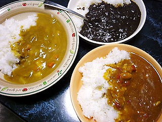 本日は(最近では)珍しく私のほうが閣下より遅く帰宅。毎日ご飯作っていたら・・・。ナニゲに賞味期限が近づいてくるレトルトモノも消費せねば!と言うことに気が付き。本日はカレーヽ(´ー`)ノ買い置きレトルトから3種!(・ω・ )モニュ?二人ですけど( ´ロ`)なにか?こんな感じ~↓。内訳は↓。【銀座ろくさん亭 六三郎のまかないカレー】コレ!!レンジで温められるんですよ!!袋のママ!!箱のママ!!蒸気口がついてて、そこから蒸気逃がしてるんです。コレってすごい!!湯せんも皿に移してラップでチンもめんどくさい人は私だけじゃないはずダー!!でも・・・。うん・・・。和風でね・・・。うどんにも合うって書いてたしね。カレーッェ!!!カレーッェ!!っていう気分の日にはコレじゃないと思うな・・・。ま、箱の六三郎さんの渋さにまぁ、ヨシとしよう・・・。【横濱カレーミュージアム 黒カレー 中辛 200g】こちら↑は。まぁ、間違いないでしょ。σ゚д゚)ボーノ!σ゚д゚)ボーノ!σ゚д゚)ボーノ!今日の中で1等でした!!ひき肉もおいしいし。コクがすばらしいッス!!で。あとはコチラ↓。【無印良品レッドカレー】無印の食品は扱いやすいし、ハズレがないので好き。お菓子もジュースもご飯モノも。てな感じの手抜きご飯でしたが。大満足!!