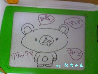 父ちゃん、スルーして( TДT)ゴメンヨー。笑【リリックマ】って!!(ノ∇≦、)ノ彡☆ キャハハ!!バンバンッ!!絵もすごいうまい!!閣下の超芸術品もいつか公開したい!!爆でわ!!りりぃの父ちゃん作【リリックマ】公開です。最近のリリックマ。おいしー。まんま。あけてー。ハッキリしゃべるそうです。りりぃままは言いました。「食べ物関連ばっかり・・・」食いしん坊りりぃ。ヵヮ。゚+.(・∀・)゚+.゚ィィ!!父ちゃん、リクエストありがとぅ ( ´∀`)ノ⌒。また力作できたら、お待ちしてます!笑そっちに行くことになったら、m(▼皿▼)m ヨロシュウ。