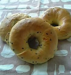 自分でもこの有言実行にバンザイ!!笑早速、昨日のマンゴーベーグルに続け~~!っと焼いてみました。黒ゴマ&チーズBAGELトリオ~~♪250gの粉に対して140ccの水で捏ねる作業はかなりの力仕事なんだけど、力仕事は、ま・か・せ・て♪の私(笑)が、しか~しさすがに連ちゃんだとキツイ・・(あっ、歳には勝てないか・・・苦笑)でお美味しいBAGEL作りたいっ!!食べたいっ!!この気持ちたちが頑張った!!笑生地にはパパの実家で収穫された黒ゴマたち。で、チーズはお友達のまきちゃんにもらったゴーダ・エグモントチーズをダイス状にして中に折り込んで。今回はケトリング後、すぐにオーブンへGO!!しわしわ~は解消されて満足♪かと思いきや、なんと1個チーズを欲張りすぎて中からチーズたちが「きっつーい!出してくれぇぇぇ」ダラ~と流れちゃいました。苦笑なので↑の写真は4個のところ3個のトリオな訳で・・・笑トリオの中でも一番ツルツルにかわいく焼きあがったのがこのコ♪つるりんBAGLEさん♪ちなみに今回都合により登場しなかった(笑)チーズがダラ~なやつは焼き立てをいただきました♪お得意の試食感覚でね♪笑