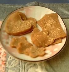 最近購入してママたちとのランチや夕食にも大活躍しているYOMEさんレシピ♪万能ダレなんてモリモリ作っちゃってるの。で、やっと気になってたアイツをKAYと一緒に作ってみたよ~和菓子♪八つ橋さ~ん私もKAYも和菓子好き☆とくにKAYは求肥だのわらびもちだのもっちり系がお好みで、八つ橋の餡入りの定番スタイル三角たちも好きだけどこの皮(?)のみってのがそうとう好きで最近じゃスーパーでもすあまの横に並んでるから「ママ、八つ橋にしようよ。今日のおやつは。」なんて感じ。笑レシピではオレンジの皮のすりおろしがちょい入ってたんだけど無かったのでシナモンパウダーのみ。きな粉をた~ぷり振ったまな板でもっちり生地をこねるのは結構楽しかったなぁ♪スケッパーで切ってたらKAYがクッキー型でも作りたいというのでとりあえずポンポン抜いてみたよ。2人で切れ端などをパクパクつまみ食いしながら楽しい美味しいおやつが出来ました~今度は抹茶を混ぜて作りたいな♪そのときはつぶあんを、はさんじゃおっと♪