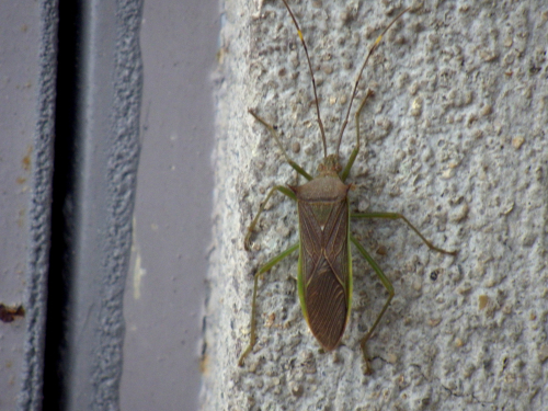 JR東寝屋川駅の東側の山麓に打上公園という小さな公園がある。ここを登っていくと打上神社があるのだが、ちょうど今は工事中で通れない。なので、本来の参道から登る。鳥居のそばの小屋にミナミトゲヘリカメムシがとまっていた。名前の通り南方系の種で温暖化の影響かどうかは分からないが、最近よく目立つようになった種のひとつだ。柑橘類や柿などの実に被害を及ぼすので果実栽培にとっては憎き害虫である。2014.12.15 打上神社にほんブログ村人気ブログランキングへ