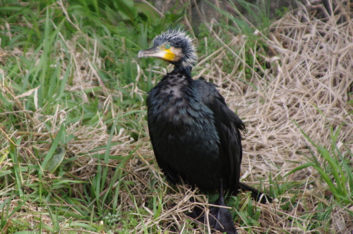 ときどき雪の舞う午後でしたが、近所をぐるりと散歩した。讃良川の中の草むらに黒い影、近づくとぐっしょりと濡れたカワウでした。通常はこの距離ならすぐに逃げるのだがこの鳥は飛び立たなかった。寒くて少し弱っていたのかもしれない。あるいは濡れすぎて飛べなかったか。カワウの羽は油分が少なく水がなかなか切れないらしい。だからカワウはよく羽を拡げて乾かしているのだそうだ。 眼が薄いブルーできれいです。2015.02.09 讃良川にほんブログ村人気ブログランキングへ