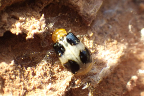 寝屋川市の東部丘陵を進んで山の中に入ると住所が四条畷市に変わる。近くなので散歩がてらにちょこっと出かける。2年前にヤシャブシの樹皮下でヨツボシハムシを見たことがあったので、今日もちょっぴり浮き上がった樹皮を裏返してみる。いましたヨツボシハムシです。隣の樹皮下にももう1匹いました。 この虫の食べ物は幼虫も成虫もカラスウリ、アマチャヅルなどの葉だそうです。まだまだしばらく眠っていないと食べ物はありません。隣で一緒にお休み中のクモに食べられないように。2015.02.16 四条畷市岡山にほんブログ村人気ブログランキングへ