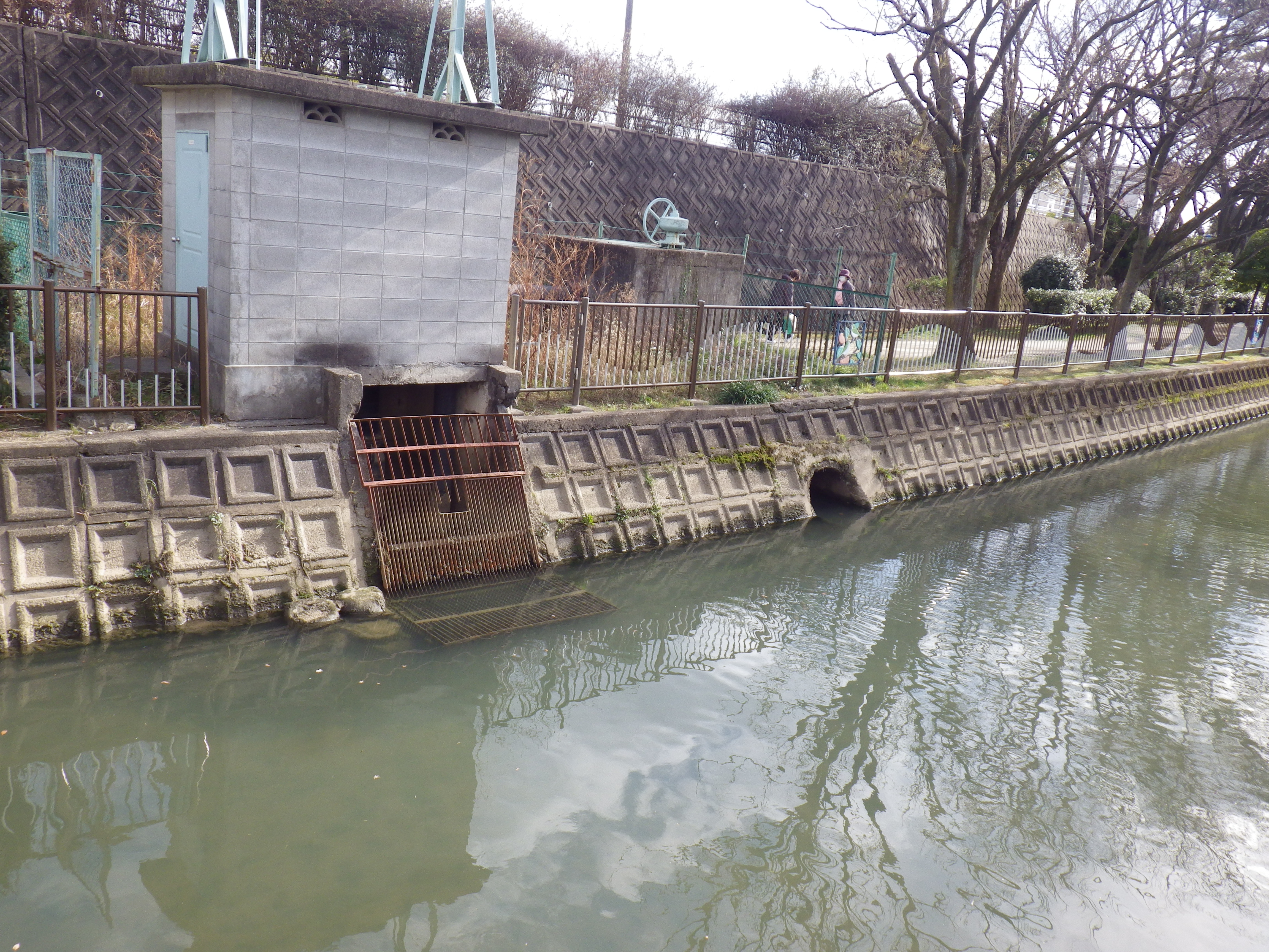 高くなった寝屋川(正面の石組の上が寝屋川)の下をくぐって反対側へ水を送った。