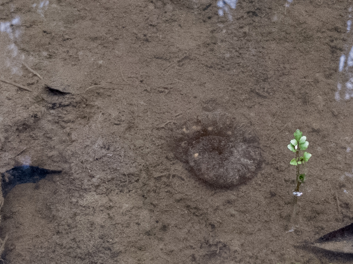 イノシシの開けた穴に溜まった水の中で元気に泳いでいます。