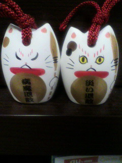 皆さん、お久しぶりです。今日は、ちょっと足を延ばして福岡県宮若市に行ってきました♪宮若市は、博多からバイクで1時間弱。行く途中に峠があるので、涼しい小旅行でした。(*^-^*)宮若市へ行ったお目当ては、これ!「追出し猫」です。宮若市の特産品で、招き猫の一種なんですが、珍しいのがその顔!!猫が、怒った顔なんですよ♪宮若市には猫塚というところがあって、昔そこのお寺に1匹の大ねずみが住み着き、そのねずみを退治するために何百匹もの猫が闘って退治したという伝説があるんだそうです。ねずみを追出したので、「追出し猫」。悪いものを追出してくれる猫なんです。でもこの猫の珍しいところはこれだけじゃなくて、、、じゃーん!!裏側に、にっこり微笑んだ猫の顔がついているのです。この顔で、良いものを呼び寄せてくれるってわけ♪表と裏に別の顔がついている招き猫って、珍しいですよね♪ちなみに、猫のお腹の文字は付属のシールで、10種類から好きな言葉を選んで貼ることができます。きよかは「健康」と「病魔退散」、「幸運」と「災い退散」を選びました♪私たちは脇田温泉の旅館のおみやげ物や産にいって買いましたが、こちら↓からお取り寄せもできます♪若宮町商工会ホームページミルさん「我が家にも幸運が来るといいにょー♪」