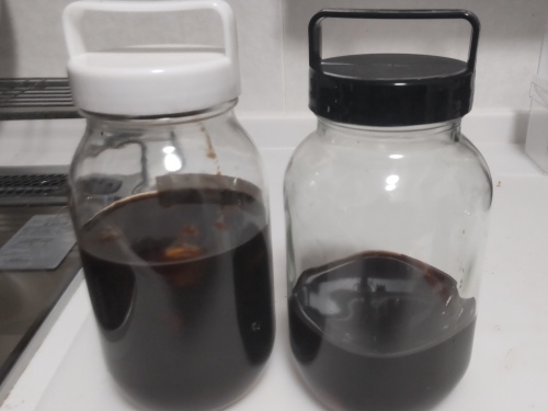 一昨年、いただいた梅で普通の梅シロップをつけました。青梅と氷砂糖で、甘酸っぱいけど基本甘いシロップです。今年も梅をいただきました。で、ちょっと違うシロップと他に別のもの作ろう!で、黒糖でシロップ作りました。少なくなってる方は既に飲んじゃったから(^.^)黒糖で漬けるだけでかなり味が変りますね~美味しいです!ソーダ割りが最高です。梅の可能性は無限大ですね~カムチャツカの地震による津波警報驚きました。この暑さで避難を余儀なくされて大変だったとお察しします。この後、どうなるんでしょうか。不安ですけど天災ですもんね・・・・7月15日のメイちゃんキラちゃん