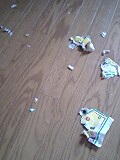 お昼のミルクも終わり、満腹でウトウトしていたので寝るのかと思ったら遊び始めた次男。残骸が・・・・・!!!紙です。(兄ちゃんのです。ピンチ! 笑)存分にかじって逃走を図る次男。捕まえて顔を見たら、顔中紙の粉だらけ。大満足!って顔をしてカメラを見てくれました。ありがと。今赤い顔をしてたからウ●チかと思ったら、口の中から紙が… (汗)もちろんウ●チもしてました。 紙で遊んだあとは、しまじろうのおもちゃ。トイレトレーニングのためのものです。お兄ちゃんはこんなものでは全然ダメだったけど・・・弟はこれで出来るかな? ダメだろうな。良く飲み、良く食べ、良く寝て、良く遊ぶ。これは、、、、お兄ちゃん以上に手がかかるんだろうな~明日は次男の定期健診の日です。お座りもするし、問題なさそう☆