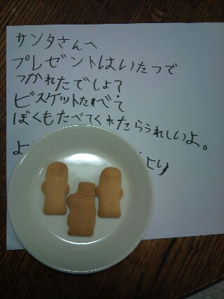 メリークリスマス。and… Happy Birthday 私。25日。無事に34になりましたとさ(泣)嬉しいような、悲しいような… 複雑な気分。でも、長男は私が34だと信じてくれないのです。「母さんは24じゃろ? 34じゃないよ~」ってね。「こんなに若いのに34なんて嘘じゃ」と言ってくれるので、私は嬉しすぎて「母さん24よ」とまたまた大ウソ付いてしまいました。みなさま、お許しを~長男の気持ちを傷つけないためにも、私は24ということにしておきます(笑)そんな子供たち、無事にサンタさんは登場し、枕もとにはプレゼントが置かれてます。長男はサンタさん宛てに手紙を書いてビスケットを用意してました。 手紙付きでね。心優しき長男の性格が手紙にも表れてます。そして… 次男はというと。字が書けないけど、何かしたかったらしく… てれびくん(かな?)の一部分を広げて置いてました。何をアピールしたかったんだろうか?どうしてもサンタさんに見て欲しかったようです。さすがに爆笑してしまいました。次男らしい… その一言です。さて、23日は、主人と久しぶりにデートでした。楽しかった~色々買いましたから!! そりゃ楽しいね。いきなり買ったものは、一眼レフ(苦笑) オリンパスペンライト。最近「一眼レフが欲しい」としつこいくらい言ってた私。最初は無視されてたんだけど、あまりにもうるさいので、主人が色々調べてくれて最終的に電気屋さんで、色々相談して決定しました。サイコ~~~これで、運動会や発表会もバッチリ!まだ全然使い方が分からず、思考錯誤です。なので、レンズが収まりきらない状態でSTOP。おかしな光景で写真に収めてしまいました。 お恥ずかしい。私が欲しがったのに、勉強する気なし(苦笑)主人に色々教えてもらおうと思います。そして、メインの?!私のプレゼント~今回は梨花ちゃんデザインのjupiterにしました☆ 可愛い箱に入ってます。最初はリングだけ…と思ってたんだけど、お店の人にセットを勧められ。思わずそれをお願いしちゃいました。主人の予算を少しオーバーしてしまったけど(汗) かなり小さいダイヤのリングとネックレス。ホント小ぶりです。重ねづけにピッタリ?! 小さいでしょ?最後の1セットだったのです。サイズもピッタリで…友達と以前jupiterをチェックしてました。あまり地方には置いてなくて。でも、運よく広島には取扱店がありまして…だいたいageteを買っていただくのですが、今年はjupiterに。 ネックレスも小さいでしょ?良く見ないとダイヤが分からないくらいの小ささ。重ねづけだね~ これも。あとね、もう1つ、あるんだけど・・・それはまた後日。もう日付が変わって25日ですね。クリスマスです。25日が過ぎると、一気にあちこちでお正月モードになりますよね。新年まであと少し。元気に年末年始を過ごしたいものです。昨年は。。次男がRSウイルスになり、大変でした。病院のはしごで。今年はみんなで元気に新年を迎えたい!それだけです。みなさまも良いクリスマスを☆