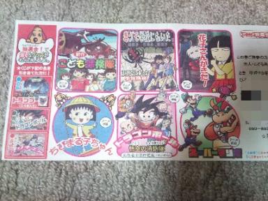 今日は土曜日(もうすぐ日曜ですが)子供たちなぜか朝5時に目覚めて・・・(汗)私はとてもじゃないけど起きあがれない!!先に起きてた主人にお願いしました。なぜ子供って休みの日は早起きなんでしょうか???次男はさすがに早く起きすぎたみたいで、お昼前から昼寝しました。でも!!今日は午後からアニメ鑑賞に出掛ける予定。 近くの公民館でこのアニメ上映会があったのです。学校&幼稚園からこのチケットを貰って帰って来た子供たち。「行く!」と言われたので、私も約束してしまって。でも、次男が寝てる~受け付け開始は13時20分から。上映は50分から。13時の時点で起きる気配なし。お昼に帰ってきた主人が、一生懸命起こしてくれましたがダメ。私がダメ元で起こしたら、運よくお目覚め。急いでおむすびを食べさせて、3人で歩いて会場へ。あまり期待はしてなかったけど…会場はいっぱい!ってほどでもなく、中学年手前の子供たちがほとんど。ちなみに1人800円。(高!!)このチケットがあるから800円、なければ900円。内容は…かなり微妙。何年前の??って聞きたくなるような。まるちゃんなんて、私が小さい頃の放送されてた映像で、歌も昔の。だから子供たちはチンプンカンプン状態。ドラゴンボールも、孫悟空が如意棒使うん?って驚いてたし…そうか、今やってる「改」では如意棒とか使わんよね~2時間の上映。私は寝ておこうと思ったのですが、次男がゴソゴソして、やっぱり思うようにはいきませんでした。2時間終わって、解放~~~もし、来年またあったとしても、来ないな。3人分2400円。もったいない~~~~~!(ごめんなさい)帰ってきてからは、近所の男の子たちと遊ぶ息子たち。毎日恒例行事です。こんなに毎日毎日遊んで大丈夫?って思うのですが、子供は違うんですかね~?野球をしてみたり、最近はベイブレードで盛り上がってるようです。同じような年齢なので、気も合うみたいです。今日驚いたこと。普段、学校の牛乳を飲むだけで、家ではあんまり牛乳を飲まない長男が今日はどうしたのか???牛乳をガブガブ飲んでました!!!ビックリ~~~何があったんだい? 本当に驚きました。ご飯も今までより良く食べるようになったし、牛乳まで?!あまりに変化が大きすぎて、私が付いて行けない。クラスでは一番小さい長男。他の男の子は頭1つ分大きいんです。まぁ、成長には個人差があるし、長男は私に似て後半に成長するタイプだと思ってるのでさほど焦ってはおりませんが、最近の長男を見てたら大きくなってくれるのかな?て少し期待。外で遊ぶって大切ですね。ここ最近、カードゲームもしてないや!近くにないんだけど(苦笑)唯一の楽しみは、Wiiみたいです。そうそう、Wiiでマリオスポーツ?!をしてて、今日のアニメ上映でもマリオがあったんだけど会場の子供たちもマリオの時だけ、結構盛り上がってました。盛り上がってたというより・・・ 突っ込んでたのが正解かな?昔も人気があったけど、今でもマリオは人気があるんですね~そんなこんなで、土曜は終わって行きました!明日は長男の靴の調達に主人がユニクロに行きたいみたいなのでお買い物dayになりそうです。************************************************************** アラビアのムーミン。これは新しいのかな?カップやボウルのキャラクターは知らないんですが(汗)プレートは可愛い☆ 鳥獣絵巻のグッズ。最近好きです。座布団も可愛い☆トートも。