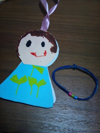 今日は幼稚園の参観日でした。いつぶり?もう何か月も参観日なんてなかったから…新鮮でしたね。あ、9月の敬老参観があってから、、、だから相当ですね。前の幼稚園は月1で幼稚園に行ってたような?この違いにもビックリです。今日の参観は、子供たちの手作りを見る。・・・が、途中から手伝うに変更。本来なら子供たちだけの力で完成させるべきものなんでしょうけど。1人の親が加わり(手をだし)、次々に。私は、頑固なのか?絶対手伝わない!て決めてるのでとにかく、端っこのほうから見るだけ。でもね、今回の手作り品は、少々難しい。紐を三つ編みをして、出来上がったらアイロンビーズ?を通してブレスレットを作る。というものでした。三つ編みの時点では私は手伝わない。見てたら、緩々の三つ編みが…(苦笑)これも子供の作品、それでよし!と見てました。問題は、ビーズ通し。3本の紐がテープでまとまってるんだけど、その部分が太いためにビーズの穴に通らない(汗)大人でも汗が出そうなほどだから、子供には無理!あ、うちの子のが太かっただけで、他の子は余裕でビーズ通してました。器用な母さんなら、サササッと細くまとめて、ビーズを通せるように出来たんでしょうね。残念…全然、出来なくて、無理やり通して…結果、紐に通ったビーズの数、3つ。ごっめ~~~~~ん!このブレスレットが、それです。3つしかないでしょ?他の子は、びっしり通してたのに、次男はこれだけ(泣)でもね、ワンポイントになるからいいんです!(カビラ風)私はこれで満足です。この必死に作ったブレスレットと、事前に作っておいたらしい首飾り?を子供たちからプレゼントされました!!私の似顔絵なんでしょうね~なんて、かわいい☆ちゃんと髪の毛も茶色にしてくれてる~~このバランスがとても好きで、今回の似顔絵は私的には大満足!ただ、、、 私のワンポイント!泣きほくろが書かれてなかったのが。。残念?!服に書かれたのは…銀杏の葉だそうです。大事にしよ~っと。次男の担任の先生は、今年度初めて先生になった若い方。初めての受け持ったクラス。大変だったんでしょうね・・最後、一言挨拶されましたが、感極まって涙。子供たちから一斉に突っ込まれてましたが(苦笑)ほんわかして、まん丸い先生。可愛らしい先生です。あと数日だけれど、子供たち楽しく幼稚園生活を送ってくれたらいいな~次は、年長だ!幼稚園生活も残り1年。6年間の幼稚園生活。長かった~次年度は、役員にならなきゃいけない空気。母もガンバロ。