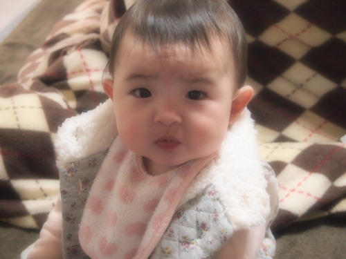 娘です…って言いたいけれど、姪っ子です。昨年?一昨年に購入した一眼レフ。前のフォトでは、どうしてかUP出来ず…今のシステムになったら、UP出来た♪嬉しいな~ 嬉しいな~って、多分自分の技術の問題だったんでしょうけどね。ぼかしなんて入れてみました。妹そっくり。目の離れ加減もそっくり。遺伝子の強さを感じるのです。あっという間にこんなに大きくなって。もうすぐ歩くのかな?滅多に会えないのが、オバとしては寂しいところです。長男は、従姉妹のことが可愛いらしく、学校から帰ってきて、ずっと遊んでました。次男は、どうやって接したらいいのか?がまだ分からないようでたまに遊んで、あとは一定の距離をとっていました。姪っ子は、初めて来た我が家に戸惑いながらも、うろうろ…女の子を間近で見て、感じたこと。動きが狭い。こんなに動かないの?って思うくらい、動く範囲が狭い。息子たちは、動けるようになったら、とにかく動いて、物を触り、手で叩き、ジッとすることがなかったんだけど…女の子って、1mくらいの範囲しか動かない。なんか、平和な空気を感じました。私、経験したことない空気だな…て。笑うのも、声が小さく、「キャッ」って感じ?とにかく、小動物です。見てて、うらやましかったです。