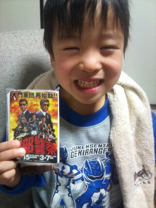 先週、恐ろしいほどの熱にうなされていた次男。土曜からは熱も出なくなり、今のところ元気に過ごしています。そんな次男は、どういうわけか、タオルが大好きです。小さいころは、おしゃぶりの代わりにタオル。握って離さない!ってほどではないけれど…大きくなった今は、首にタオルを巻いたり頬にスリスリしてみたり・・・タオルなら何でもOK!なわけじゃないらしく次男になりに「こだわり」があるようです。一番好きなのはね。私が使ってたタオル。シャンプーの後などに、使ってたタオルが好きらしいです。あんまり濡れてないタオルだと、寝るときに枕の上に自分で上手にタオルをかけて眠ってます。で、朝になると、しっかりタオルを握って起きてくる。なんてかわいい☆☆☆そんなタオル人間な次男に、ちょいとお願いして…ムフフ(笑)本屋さんのレジ前で無料で配られていたティッシュ。しかも~~~西部警察のチラシ入り。これは、もらわなきゃいけんでしょう!3,4つ貰いたかったけれど、そこは我慢ね。1つだけ貰って帰ってきましたとさ。で、首からタオルを下げております~着てるパジャマは、昔昔の「ゲキレンジャー」パジャマ。兄ちゃんの時に買ったもの。このパジャマ、確か次男がRSウィルスで入院中に、長男も軽い肺炎になりその時に、主人が長男に買ったものです。今でもよく覚えてます~あの時が一番大変だったような気がする!初めての入院だったしね。そんなパジャマを今は次男が着て…嬉しそうにしております。私はこのティッシュを見て嬉しいのです。Mちゃん!このティッシュを見せたかったのよ~~大門素敵よね(笑)