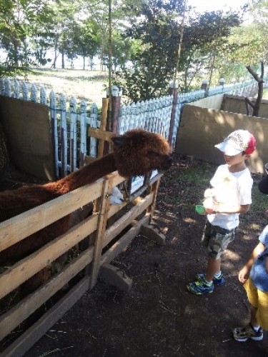 さっき、一度UPしようとしたら・・消えた(泣)頑張ってたのに、消えた。なので、少々省略しながら。前のは、阿蘇山まででしたね。阿蘇山に行った日は、主人の誕生日。プレゼントも買ってないし、ケーキもなかったんだけど主人は楽しそう&嬉しそうでした。夜は、主人の希望で焼肉。ファーム内には、数か所食べれるところがあります。周りに何もないので、中で食べるしかないのです。車でどこかに行けばあるんでしょうけどね。美味しいお肉で、お腹いっぱいでした。2日目も、汗だくで終了(初日も汗だくでした)3日目は、帰る日。午前中ファーム内で遊んで、午後からは熊本市内へ。動物と触れ合える場所があり、そこで色々体験~ ラムちゃんに餌をあげたり カピパラに餌をあげたり ブタやヤギ、ヒツジ、カメ、モンキーたち、ハナクマとか。とにかくたくさんおりました。餌もほとんどの動物にあげることができて…餌代結構かかります。長男は興味津々で餌をあげ、次男はビクビクしながら…兄弟でも違うんですね~ モルモットを膝に抱く子供達。ビビりながらの2人だったけど、無事に抱っこできました。次男は顔が少々引きつってましたけどね(笑)動物をふれあい、そのあとは熊本の博物館で展示されてる恐竜を見に行きましたよ!動物ばかりですね。 リアルに動くティラノサウルス。トリケラトプスもおりました。リアルすぎて、ちびっこは号泣してました~うちの子は長男は興味津々(もともと恐竜大好きだったので)次男は、半分逃げ腰だったけど、泣きはしませんでした。どうやら、貴重な展示品らしく、滅多に日本に来ないから・・ってことでみんなガンガン写真撮ってました。入口では写真NGってなってたんだけど…係りのお兄さんがOKって言ってたからねぇ。トリケラトプスの化石(レプリカ)にまたがり写真撮影。 みんな、写真を撮りたいのは分かるんだけど…撮ったら素早く移動してほしい。自分たちさえ良ければ、それでいい、、て感じの保護者が多くてムカッとしました。最近は多いんでしょうか?分かりませんが、自分達が撮りたいから「どいてください」って言いそのまま人のことは考えず、その場にい続ける。邪魔だと感じたなら、他の人も同じように感じるって思わないのかねぇ?って主人も言ってました。広島弁で、クレーム言ったら、速攻で移動してくれそうな感じでしたけどね。こういうとき、広島弁って、強烈なダメージを与えそうですよね。もちろん、そんな手は使いませんでしたけどね(笑)夕方、無事に広島につき、広島名物?!「むさし」のうどんとむすびを買って帰りました。「やっぱりコレだよね~ コレ食べたら、広島帰ってきたな」って思うよねって。疲れたけれど、沢山遊んで、夏の思い出が出来ました。今週からまた頑張って仕事しないとね!!子供達も、宿題と残りの夏休み、どうにか満喫してくれたら…40日以上もあった夏休み。気づけば、もうあと少し。お腹いっぱいですが、あと少しの辛抱!