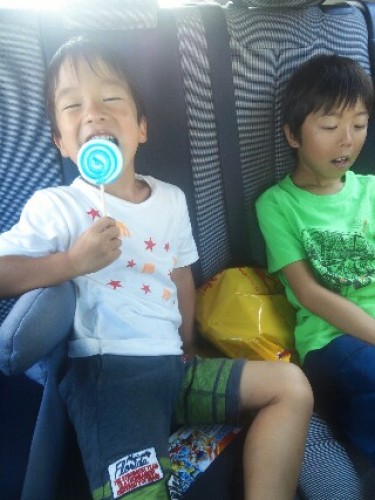 お盆の長い長い連休、いかがでしょうか?我が家は。お墓参りを済ませて、ホッとしてます。今日は夜、長男が熱っぽい?と一瞬ドキッとしましたが、すぐに熱っぽさは消えて(たぶん)眠いから体が熱くなったのかな?と思ってます。心配性なので、今夜は少し気になってしまうかと…お風呂の前だったので、念のためお風呂はパスさせて。スイカが食べたいと言ってたのですが、その前にかき氷を食べてたのでダメ。て言うと…涙。仕方なく、スイカを食べていいと言って、カットされてるスイカだったのですが一切れだけ…と約束したんだけど、いざ、一切れ食べ終えて、また涙。どうやら、一切れでは物足りなく、もう少し食べたいということみたいで。主人に、戦いごっこを申込み、ダメって言われて涙。とにかく。涙が多い長男です。こんなに泣く?って思うくらいですが、親にはどうにもできない!涙腺の管理まではね。学校では泣かないようですが、家だと少しのことで涙が出ます。感受性豊かって表現もあるんでしょうけど。私としては、もう少し強くなってもらいたいものです。次男は、長男よりは涙は出ませんが、いかにも弟て感じです。引っ越してきた当初は、近所の子と遊んでて、自分の思い通りに行かないと、ふてくされて(もちろん涙目で)帰ってきてハァァ?って状態でした。今は、それはなくなりました。子供同士、納得のいかないこともあるだろうし学年が1つでも上だと、それだけで弱い部分も出ちゃう。泣いて帰ってくる(べそをかく)はなくなりました。成長成長。あとは、自分の思いが家で通じなくても、泣かないようになってほしい。泣かない代わりに、握り拳を作りまくって、怒りに震えることもあります。どちらにしても、やめてほしい。普段クールだし、真面目なのに。変なところで幼稚です。次男はね。お調子者。 チュッパチャップスとか、ペコちゃん?のキャンディとか大好きで…あっという間に食べるんですが。今回、こんな大きいペロペロキャンディを買わされました。絶対食べれないよ!って言ったにもかかわらず…大丈夫、って聞かないから、100円だし、買ってあげたのですが。もちろん、ほぼこの形のままで残されてしまいました。甘いしね。こんなの食べきるほうが怖いんです。彼は、分かったことでしょう。…この飴は食べたらダメだって。母の忠告は一切聞き入れない息子たちです。↑男の子は、経験しないと意味が分からないそうなので、忠告は無視されます。危ないよ!ダメよ…は実体験をしない限り、聞き入れてもらえません。悲しい生き物です、男の子。連休は始まったばかり。どうか、子供たちが体調を崩さず、元気に連休を過ごせたらいいのですが。まずは、長男の熱ですね。気のせいだと祈りたい★